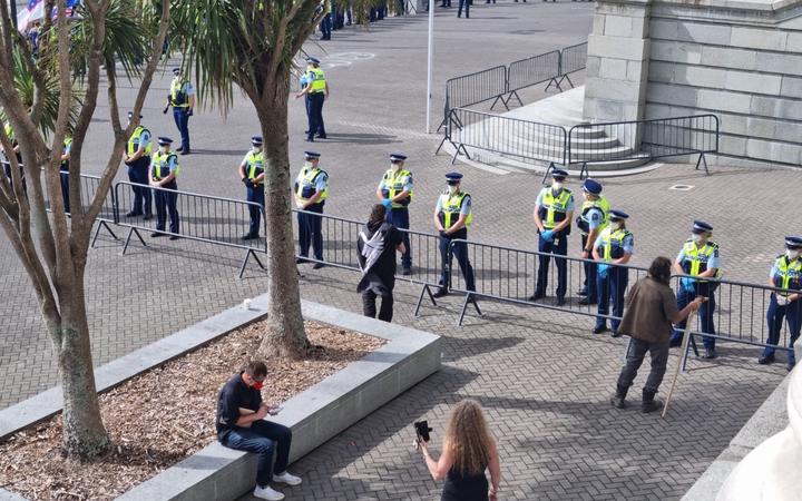 Police forming a ring around the front of Parliament today. Image: Jane Patterson/RNZ