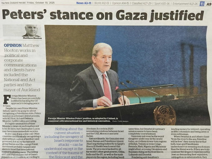 This morning New Zealand Herald columnist and political commentator Matthew Hooton was paid to write an article justifying Foreign Minister Winston Peters’ position on denying Palestinian Statehood on the eve of the first phase of Donald Trump’s 20 point plan while in tandem Peters was interviewed by Ryan Bridge as the justifications continued and propaganda glazed the land.