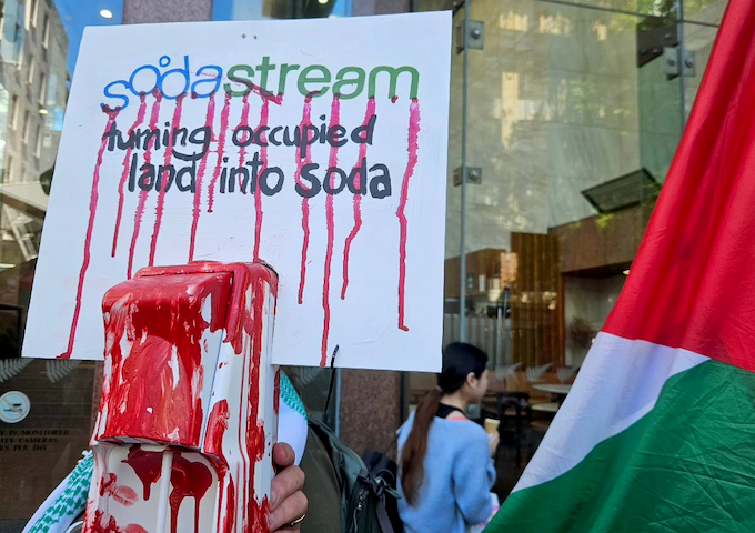 A SodaStream critical placard in today's Auckland protest declaring Israel is turning illegally occupied land into "soda". Image: Asia Pacific Report