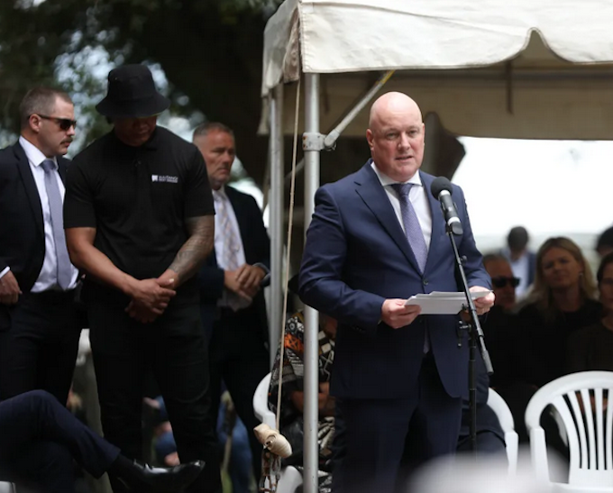 Prime Minister Christopher Luxon at Waitangi . . . “It speaks so highly of us that we can come together at times like this.” Image: RNZ/Mark Papalii