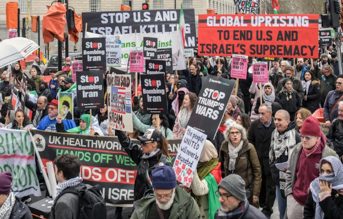 Organisers described the military strikes as “illegal” and warned that escalating conflict could place millions of civilians at risk across the Middle East.