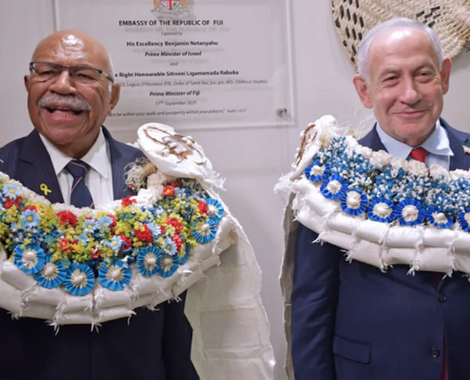 Fiji Prime Minister Sitiveni Rabuka (left) and Israeli PM Benjamin Netanyahu at Fiji's resident embassy in Jerusalem in September 2025 Image: Fiji Govt
