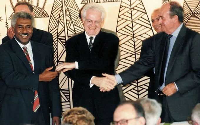 Then French prime minister Lionel Jospin (centre) shakes hands with pro-independence FLNKS leader Roch Wamytan (left) and pro-France Jacques Lafleur (right) on 5 May 1998 in Nouméa. Image: New Caledonia Govt