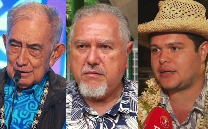 Tavini Huiraatira’s historic leader and a former president Oscar Temaru (from left), French Polynesia’s current President Moetai Brotherson, and Tematai Le Gayic . . . "old guard" political leadership pitted against a younger generation. Image: Tahiti Nui Télévision