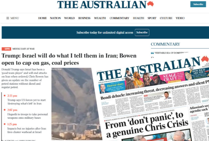 Murdoch newspapers in the United States were among the most consistent cheerleaders for the military adventurism that set the conditions for what is now unfolding. His Australian mastheads take their foreign policy cues from a worldview that treats American and Israeli strategic interests as essentially synonymous with the interests of the English-speaking world.